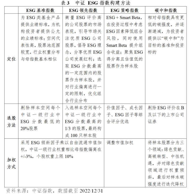 以追蹤產(chǎn)品數量靠前的指數為例,中證ESG基準指數系列在指數構建過(guò)程中考慮ESG因素以滿(mǎn)足UNPRI的責任投資要求,同時(shí)保持與基準相似的收益特征,一般用作ESG投資的業(yè)績(jì)基準。中證ESG領(lǐng)先指數系列反映ESG分數較高的股票市場(chǎng)表現,旨在將ESG作為一種財務(wù)信息之外的有效信息,獲得更穩定的長(cháng)期收益。中證ESG策略指數系列將ESG作為一種創(chuàng )新型因子Smart Beta指數,可在一定程度上降低投資風(fēng)險,提高風(fēng)險平衡收益。中證碳中和指數側重與國家氣候戰略和政策目標相結合,契合2016年以來(lái)全球對于環(huán)境氣候議題投資的持續關(guān)注,目前已發(fā)布碳中和股票、債券以及多資產(chǎn)指數。